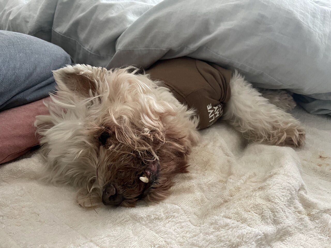 1日) ふと気づいたら口から結構な量の出血が2度あった。下あごの犬歯が癌にやられてグラグラしてて、そこから出血。翌日も少量だが出血あったが、その後は回復した。3日) お友達からもらった慣れないオヤツを食べたら、三日三晩下痢三昧となった。日中は少しユルいな程度だが、寝てるときに下痢便をしたくなって騒ぐので本当に大変な三日間だった。